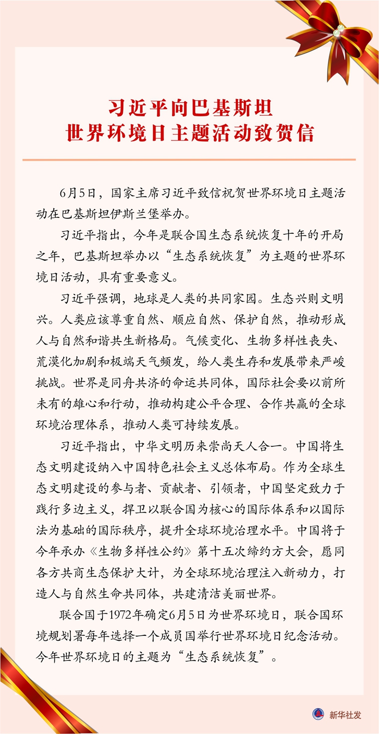 新華社北京6月5日電 6月5日,國家主席習(xí)近平致信祝賀世界環(huán)境日主題活動在巴基斯坦伊斯蘭堡舉辦。
