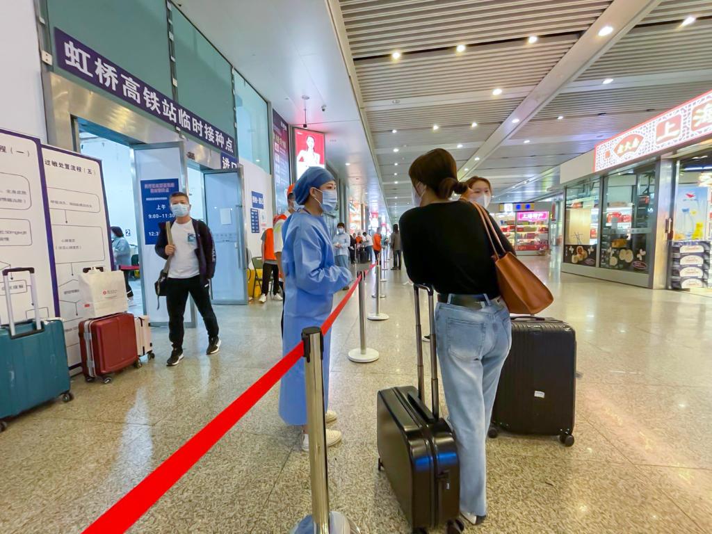 2021年5月29日,上海,旅客在上海虹橋火車站臨時疫苗接種點(diǎn)向醫(yī)務(wù)人員咨詢。新華社記者 黃安琪 攝