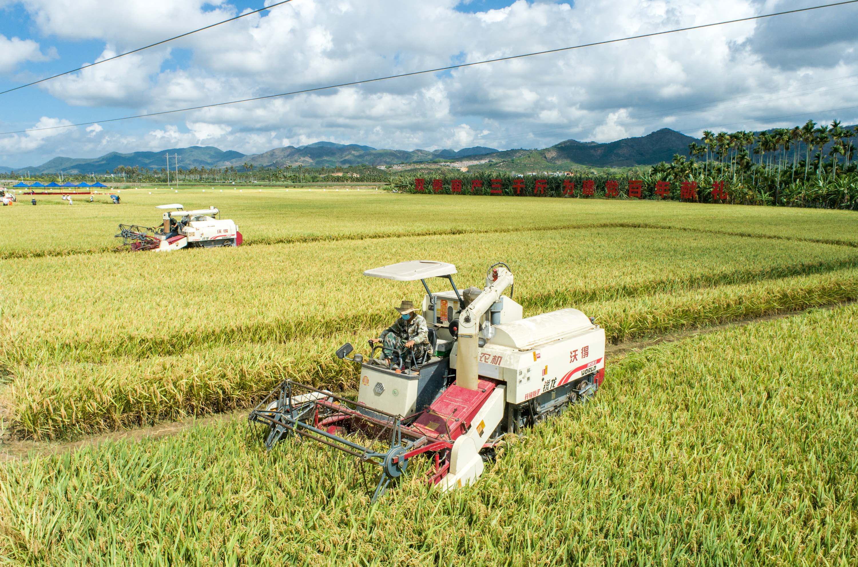 △2021年5月14日,在海南三亞市崖州區(qū)(壩頭)南繁公共試驗基地,聯(lián)合收割機在收割“超優(yōu)千號”雜交水稻。