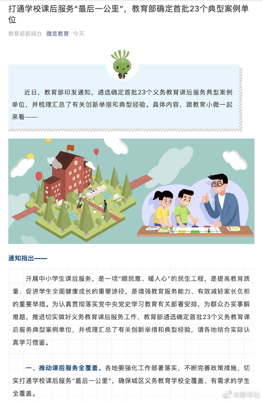 據(jù)教育部政務新媒體“微言教育”公眾號22日消息,教育部近日印發(fā)通知,為推進做好義務教育課后服務工作,遴選確定首批23個義務教育課后服務典型案例單位,并梳理匯總了有關創(chuàng)新舉措和典型經(jīng)驗,要求各地結合實際學習借鑒。通知指出,課后服務結束時間原則上不早于當?shù)仄毡榈恼O掳鄷r間后半小時;學校對有特殊需要的學生,可以提供延時托管服務,切實解決好家長接學生困難問題。學校服務性收費和代收費具體政策由各省份制訂,嚴禁以課后服務名義亂收費。 (記者余俊杰)