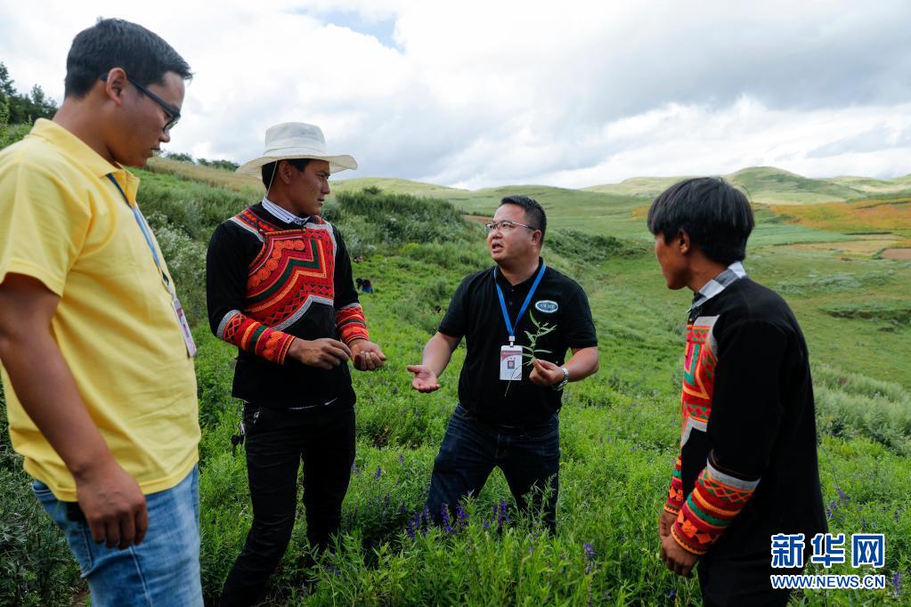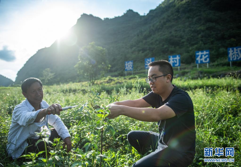 貴州省望謨縣樂旺鎮(zhèn)黨委第一書記張航(右)在農(nóng)技員岑連剛的指導下給花椒苗修枝(2020年9月15日攝)。新華社記者 陶亮 攝