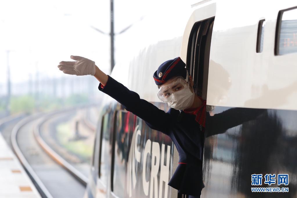 在武漢站,G431次列車乘務員艾婷婷在發(fā)車前向乘客揮手(2020年4月8日攝)。這是武漢市正式解除離漢離鄂通道管控措施后開往湖北省外的首趟始發(fā)列車。新華社記者 沈伯韓 攝