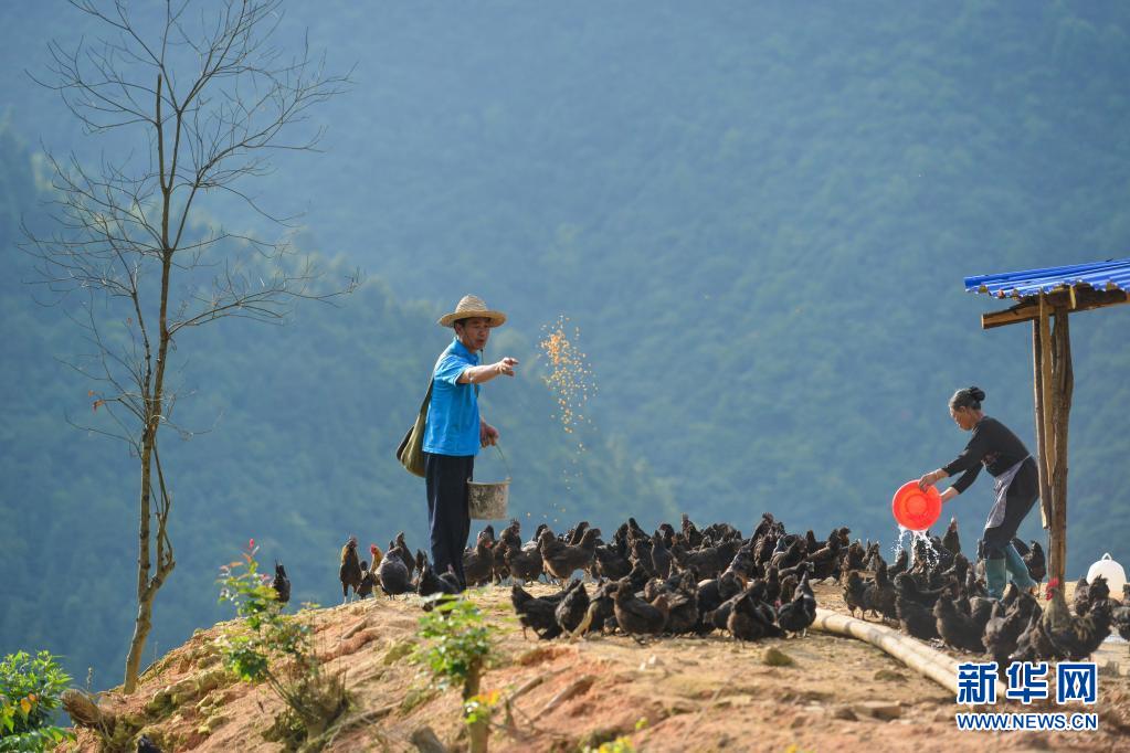 貴州省劍河縣南明鎮(zhèn)臺沙村駐村第一書記楊精澤(左)與村民在合作社里喂雞(2017年6月7日攝)。新華社記者 楊文斌 攝