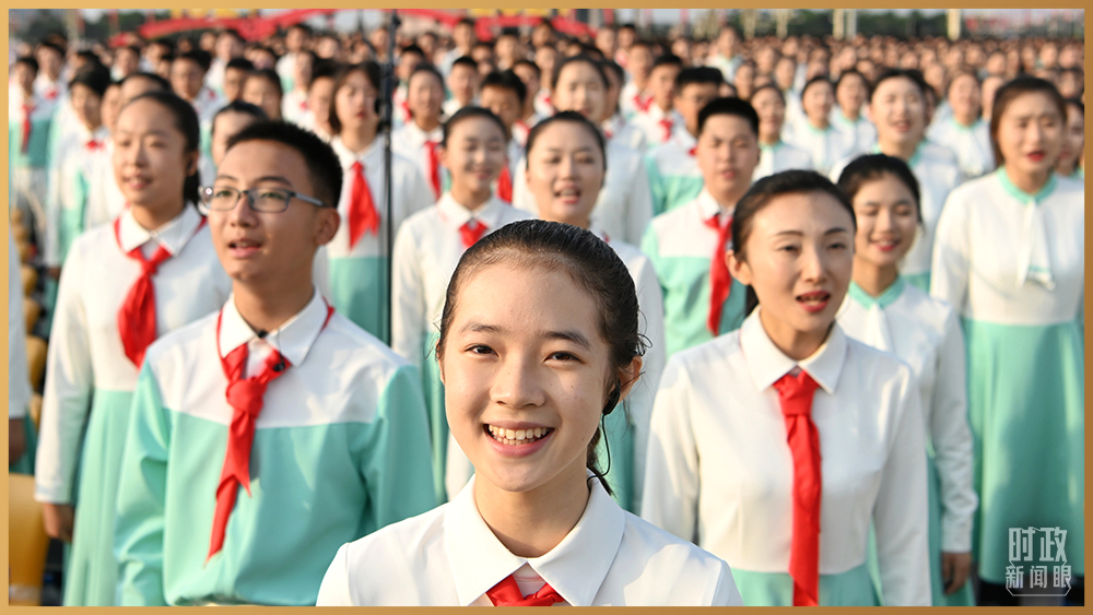 8點(diǎn)整,慶祝大會開始。100響禮炮響徹云霄。現(xiàn)場升國旗、奏唱國歌。此后,各民主黨派、工商聯(lián)和無黨派人士聯(lián)合致賀詞,由共青團(tuán)員和少先隊(duì)員組成的千人方陣集體致獻(xiàn)詞。