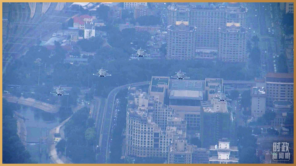 △直升機(jī)懸掛鮮紅的中國共產(chǎn)黨黨旗飛過。