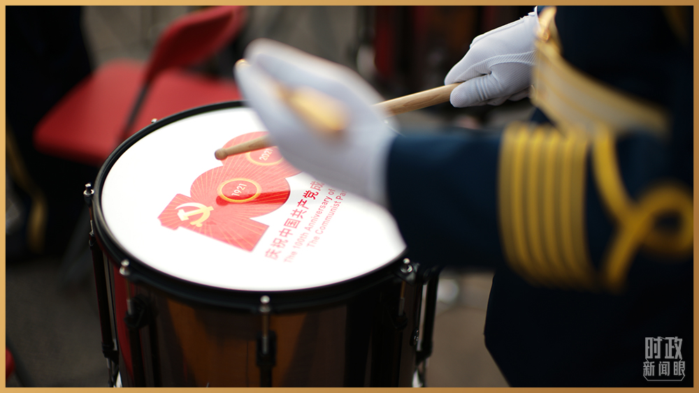 △ 鼓面上帶有建黨百年慶?;顒訕?biāo)識(總臺央視記者彭漢明拍攝)