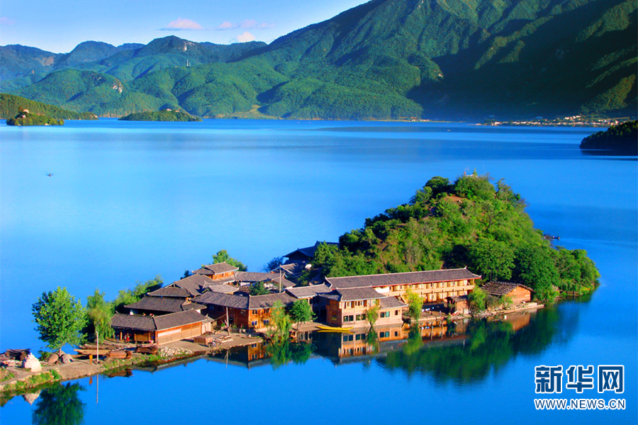 里格半島在藍天碧水的映襯下更加美麗動人。新華網(wǎng)發(fā)(麗江瀘沽湖管理局供圖)
