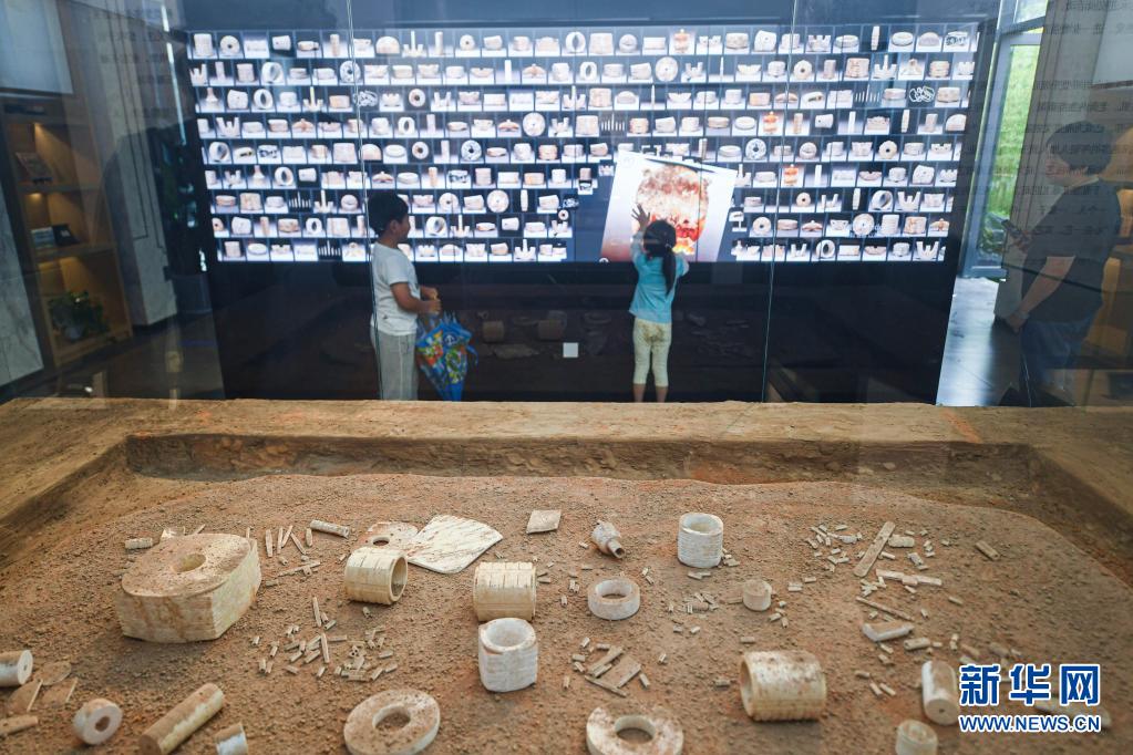 2020年6月6日,小游客在浙江省杭州市余杭區(qū)瓶窯老街的“良渚玉雕館”內(nèi)通過電子屏學(xué)習(xí)玉雕知識。新華社記者 徐昱 攝