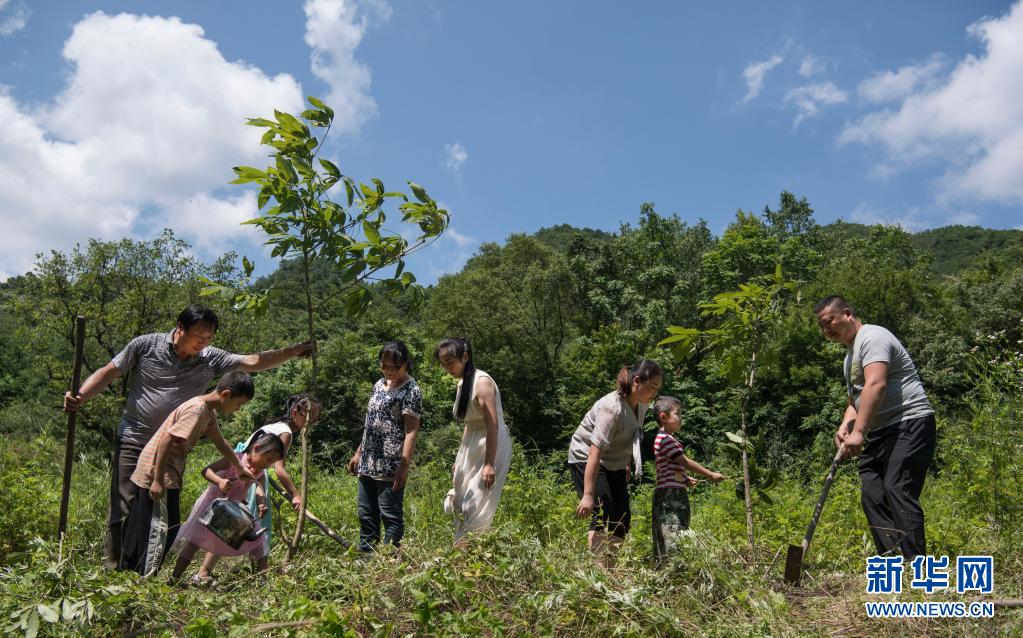 姚祖元(右一)與家人一起種樹(2019年7月13日攝)。在秦嶺深處的陜西省漢中市留壩縣火燒店鎮(zhèn),姚家五代人歷時70年深耕秦嶺的故事在當(dāng)?shù)丶矣鲬魰?,傳為佳話。新華社記者 陶明 攝