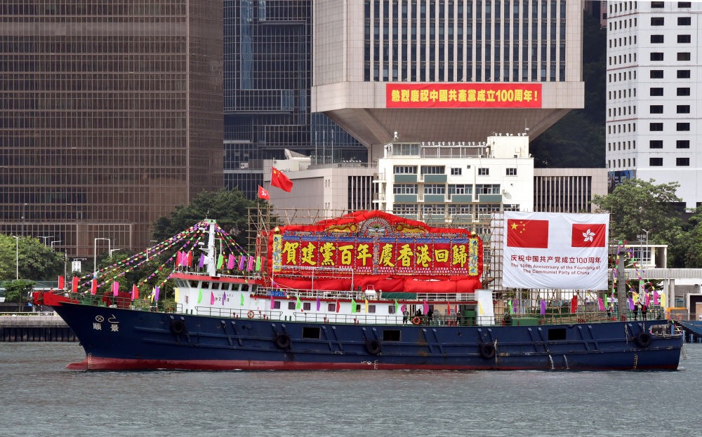 ▲7月1日,懸掛中華人民共和國(guó)國(guó)旗和香港特別行政區(qū)區(qū)旗的漁船在維多利亞港巡游。