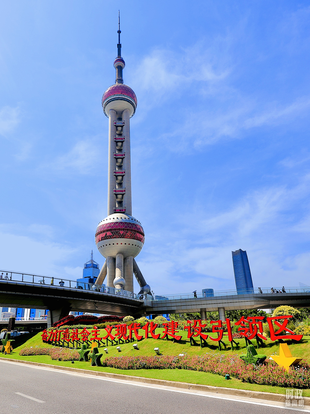 △2021年7月15日,“奮力打造社會主義現(xiàn)代化建設(shè)引領(lǐng)區(qū)”的標(biāo)語矗立在上海陸家嘴綠地中。(圖/視覺中國)