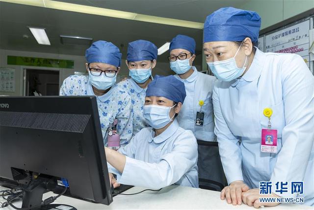 海軍軍醫(yī)大學(xué)第二附屬醫(yī)院急診、重癥醫(yī)學(xué)科護(hù)士長(zhǎng)陳靜(中)與腎內(nèi)科護(hù)士交流病人情況(8月5日攝)。新華社發(fā)(汪輝 攝)