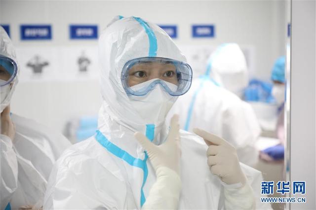 海軍軍醫(yī)大學(xué)第二附屬醫(yī)院急診、重癥醫(yī)學(xué)科護(hù)士長(zhǎng)陳靜在武漢火神山醫(yī)院進(jìn)入“紅區(qū)”前檢查防護(hù)服(3月25日攝)。新華社發(fā)(陳晨 攝)