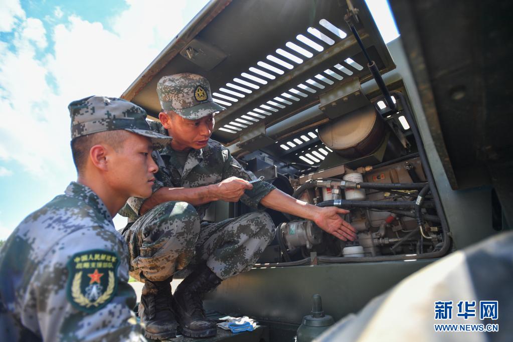 戰(zhàn)略支援部隊(duì)某大隊(duì)一級(jí)軍士長(zhǎng)高玉華(右)現(xiàn)場(chǎng)指導(dǎo)排除工程機(jī)械故障(7月23日攝)。新華社記者 陳澤國(guó) 攝