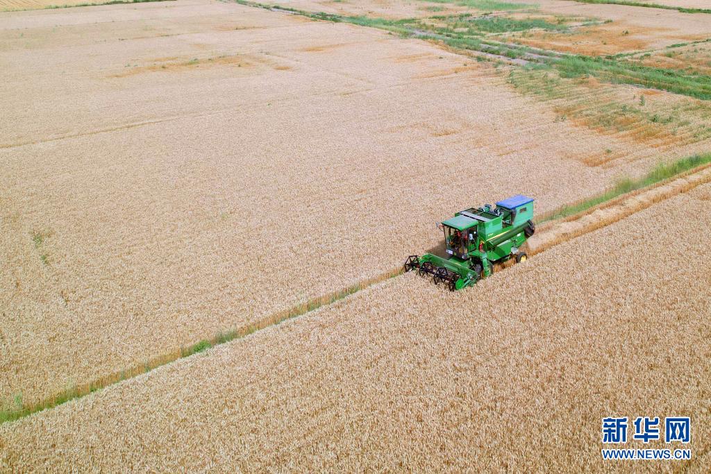 7月29日,在內(nèi)蒙古巴彥淖爾市臨河區(qū)小麥種植基地,收割機(jī)正收獲小麥(無(wú)人機(jī)照片)。新華社記者 李云平 攝