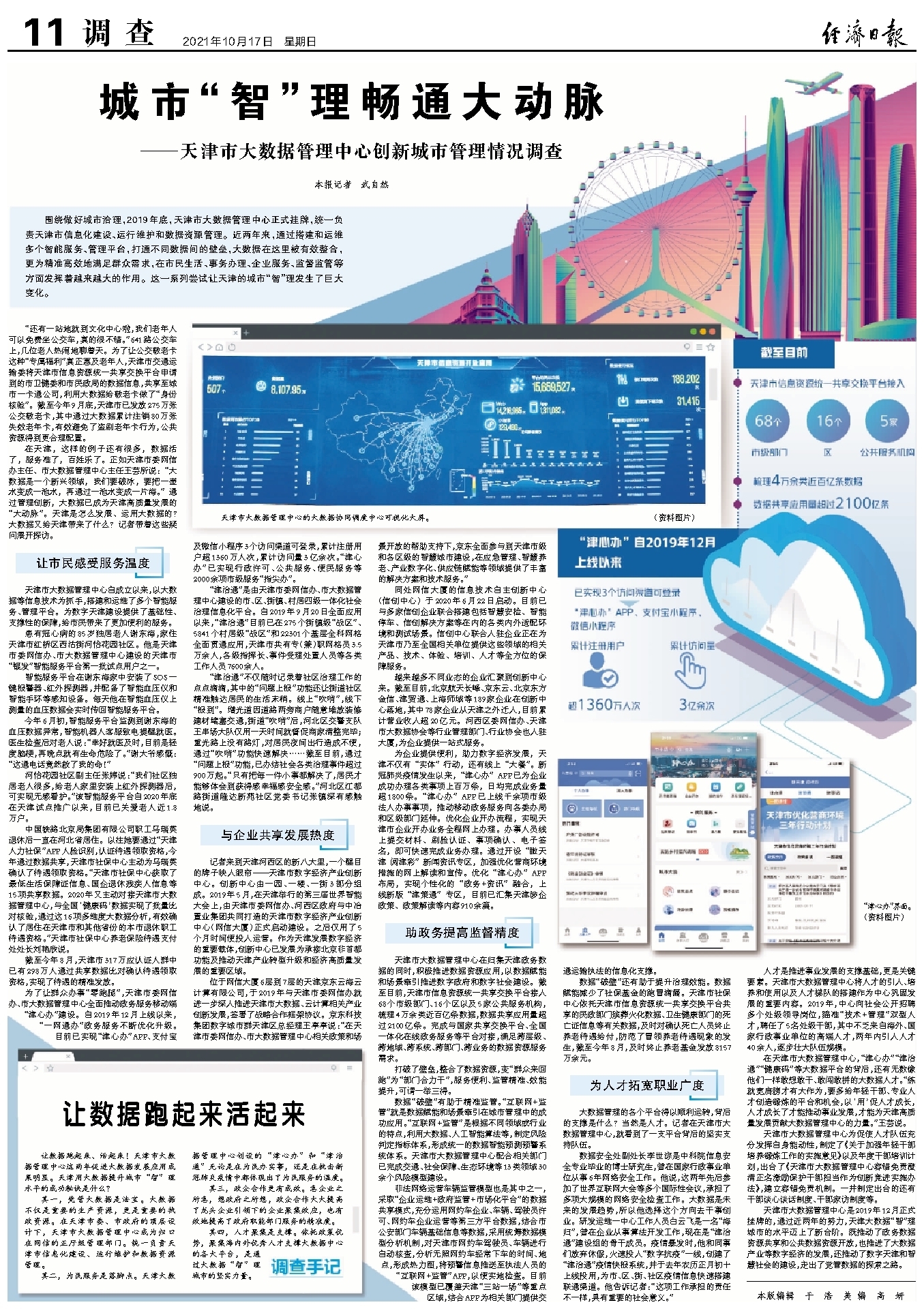 在天津,這樣的例子還有很多,數(shù)據(jù)活了,服務(wù)準(zhǔn)了,百姓樂了。正如天津市委網(wǎng)信辦主任、市大數(shù)據(jù)管理中心主任王蕓所說:“大數(shù)據(jù)是一個新興領(lǐng)域,我們要破冰,要把一壺水變成一池水,再通過一池水變成一片海。”通過管理創(chuàng)新,大數(shù)據(jù)已成為天津高質(zhì)量發(fā)展的“大動脈”。天津是怎么發(fā)展、運用大數(shù)據(jù)的?大數(shù)據(jù)又給天津帶來了什么?記者帶著這些疑問展開探訪。