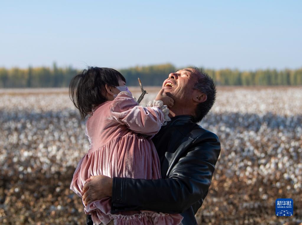 周末,家住市區(qū)的小孫女來到正在采收的棉田玩耍,陸高林抱起孫女逗樂(10月24日攝)。新華社記者 胡虎虎 攝