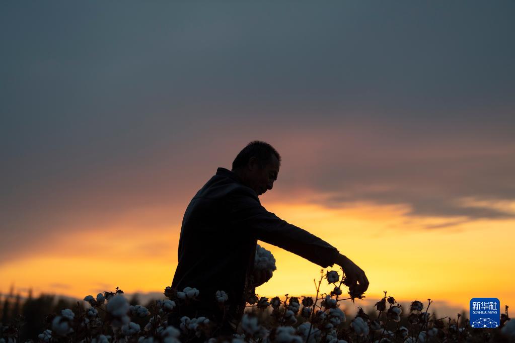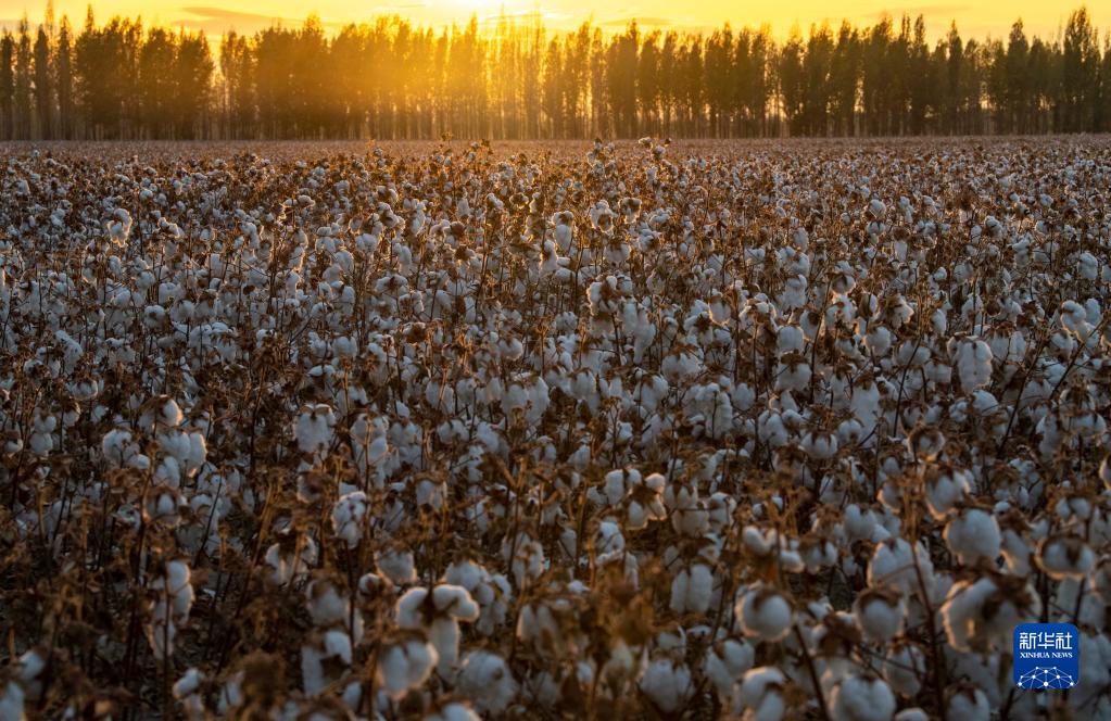秋收時(shí)節(jié),雨過天晴,落日余暉灑落在陸高林家待采收的棉田里(10月23日攝)。新華社記者 胡虎虎 攝