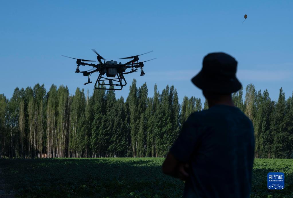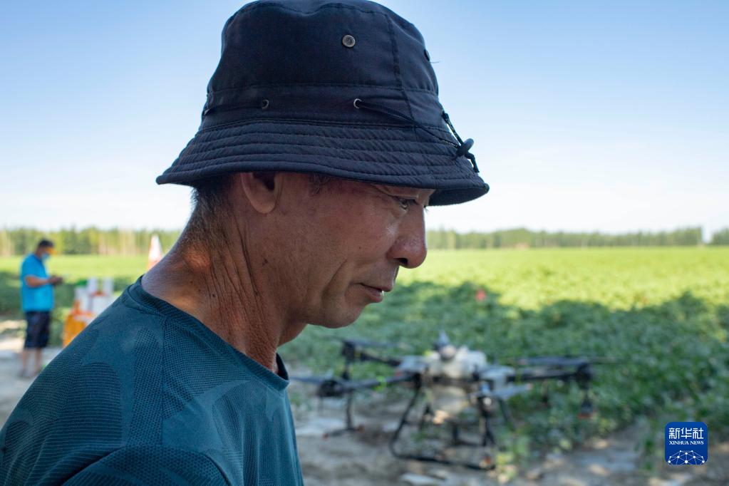盛夏田間管理期間,雇人使用植保無人機(jī)后,陸高林不用再像往常一樣駕駛拖拉機(jī)進(jìn)棉田打藥,農(nóng)活變得更為輕松高效(7月15日攝)。新華社記者 胡虎虎 攝