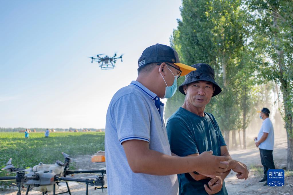 盛夏田間管理期間,陸高林(右)和沙灣市一家農(nóng)業(yè)服務(wù)團(tuán)隊(duì)負(fù)責(zé)人王福珖在棉田里談?wù)撧r(nóng)業(yè)植保無人機(jī)作業(yè)特點(diǎn)(7月15日攝)。新華社記者 胡虎虎 攝