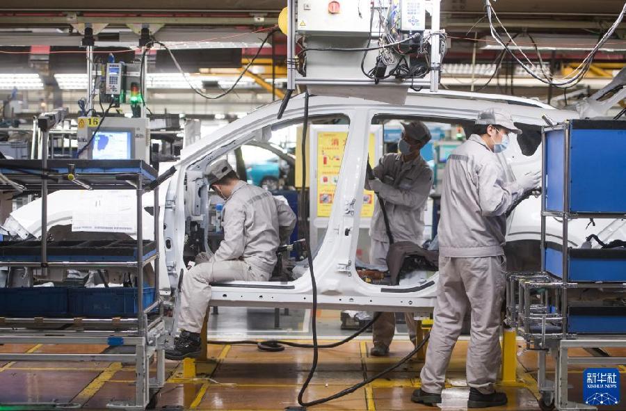 2020年3月24日,工人在湖北武漢東風(fēng)乘用車(chē)公司工廠(chǎng)總裝車(chē)間的流水線(xiàn)上作業(yè)。2020年3月下旬左右,武漢各企業(yè)開(kāi)始陸續(xù)復(fù)工復(fù)產(chǎn)。新華社記者 肖藝九 攝