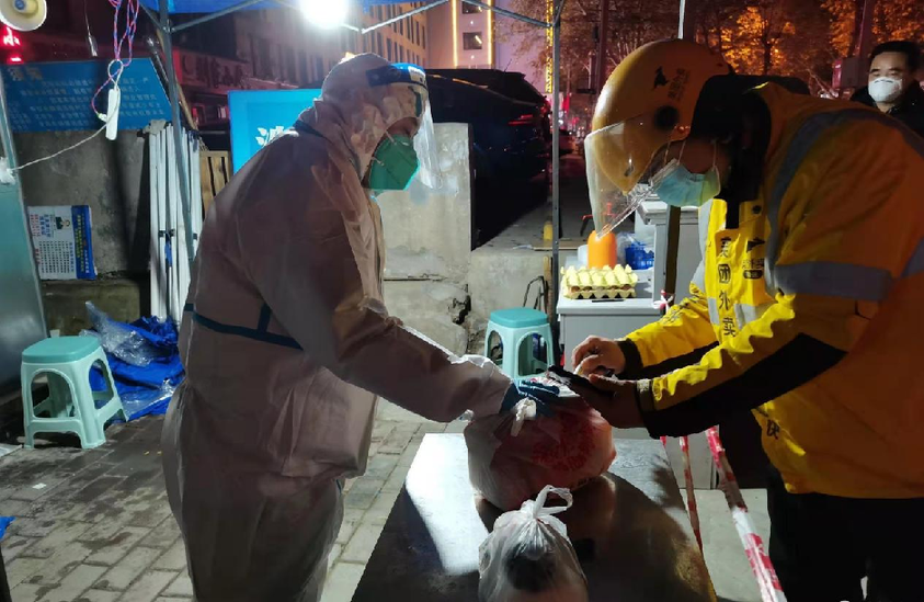 “你站在線外,寫上房號,我給你送…”、“你讓對方招個手,我給你送…”這樣的對話,在小區(qū)門口10米的安全通道里反復(fù)上演,身穿隔離服手拎物資的身影來回穿梭。