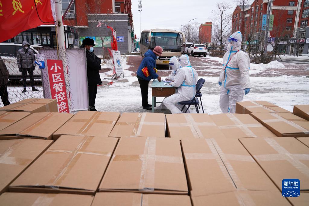 在黑龍江省黑河市愛(ài)輝區(qū)一小區(qū),社區(qū)工作人員為居民發(fā)放免費(fèi)生活物資(11月10日攝)。新華社記者 王松 攝