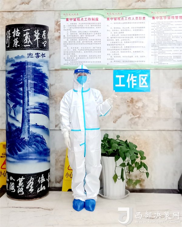 每天,她和隊(duì)員們穿著防護(hù)服24小時(shí)為隔離群眾掃碼、檢測體溫、遞送三餐、詢問留觀人員狀況、規(guī)范醫(yī)療廢棄物處置。夜深人靜時(shí),在賓館大廳和走廊間,時(shí)常可以看見她忙碌而又堅(jiān)定的背影。