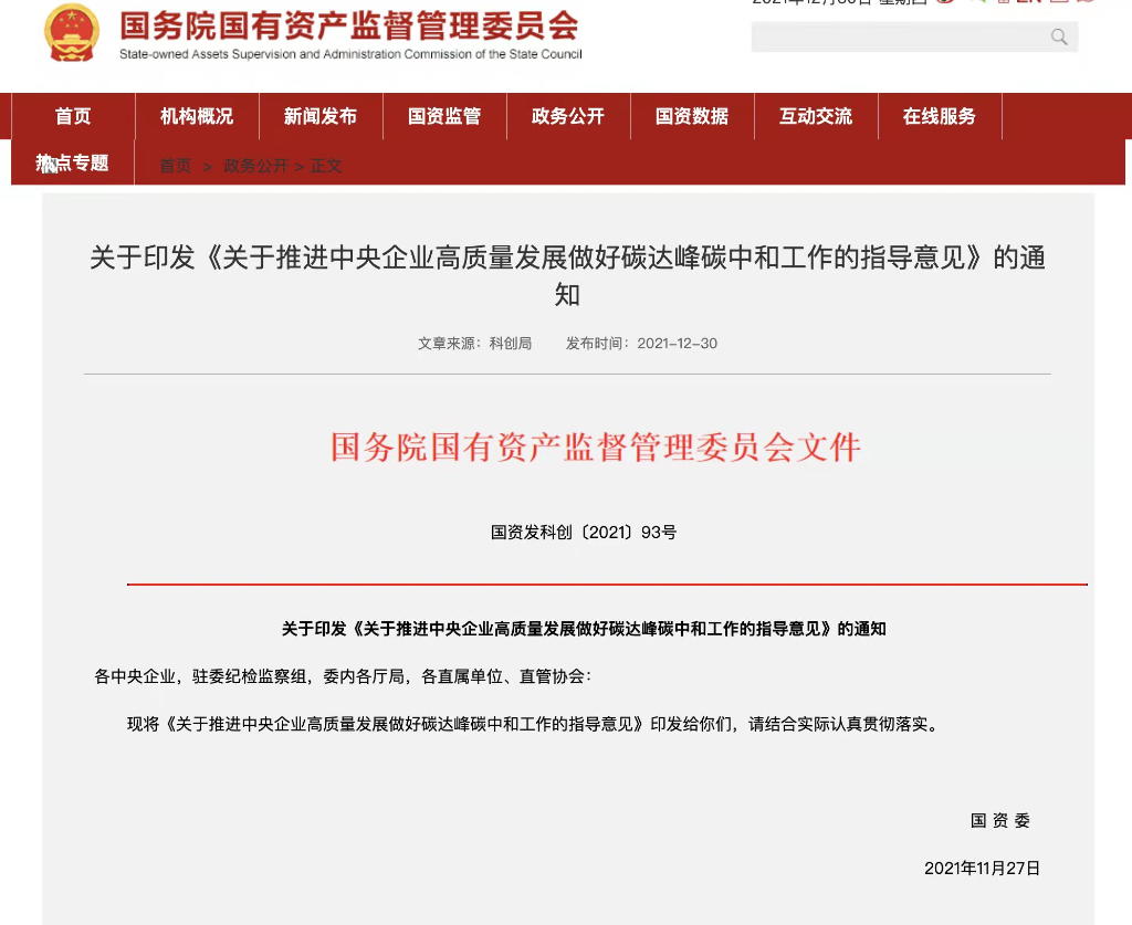 國務(wù)院國資委30日對外發(fā)布《關(guān)于推進(jìn)中央企業(yè)高質(zhì)量發(fā)展做好碳達(dá)峰碳中和工作的指導(dǎo)意見》,明確了中央企業(yè)做好碳達(dá)峰碳中和工作的總體要求與主要目標(biāo)。