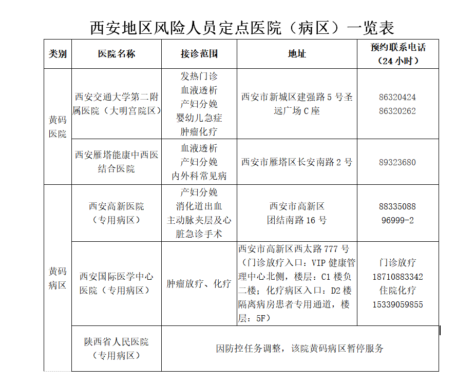 目前,經(jīng)省市協(xié)調(diào),西安地區(qū)已設立“黃碼醫(yī)院”2家“黃碼病區(qū)”2個(名單見下表),后續(xù)開設的“黃碼醫(yī)院”“黃碼病區(qū)”等風險人員定點醫(yī)院(病區(qū))由地市自行發(fā)布。