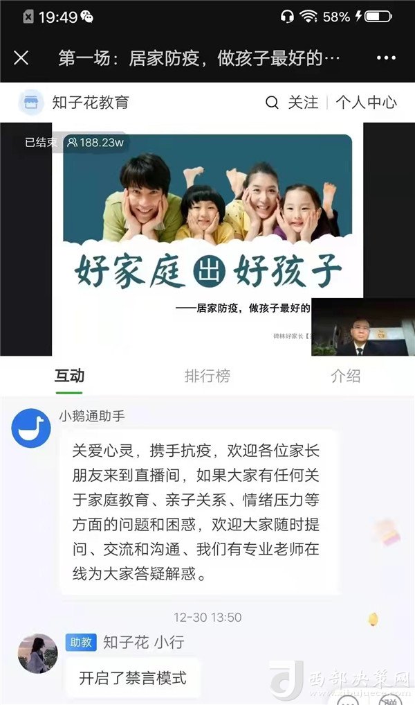 該校全體學(xué)生和學(xué)生家長按時(shí)觀看了每一場直播講座。專家提醒家長一定要在生活上多關(guān)心孩子,用心陪伴孩子,在生活中做孩子的榜樣。通過參與本次活動(dòng),大家都感覺受益匪淺,同時(shí)還拉近了親子關(guān)系,掌握了情緒調(diào)節(jié)的小技巧,引導(dǎo)家長和孩子們能更加積極樂觀的適應(yīng)疫情下的生活,享受美好的親子時(shí)光。