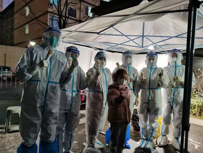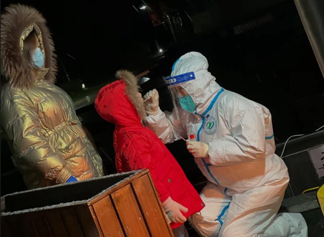 “姐姐,你冷不冷,你手疼不疼?”在排隊的隊伍中,一個小姑娘帶著哭腔問身著防護服的王航英。原來,王航英已經(jīng)連續(xù)采集核酸近十個小時,換班時她脫下手套,想抽一張紙,結(jié)果雙手被凍得通紅,反復(fù)幾次都沒成功。