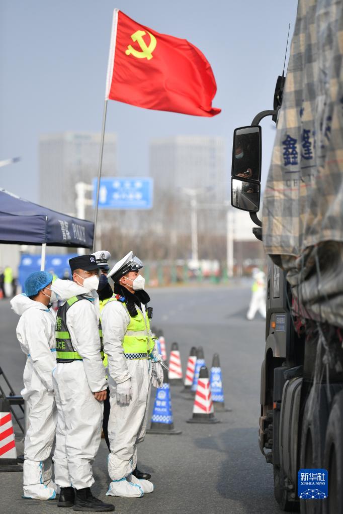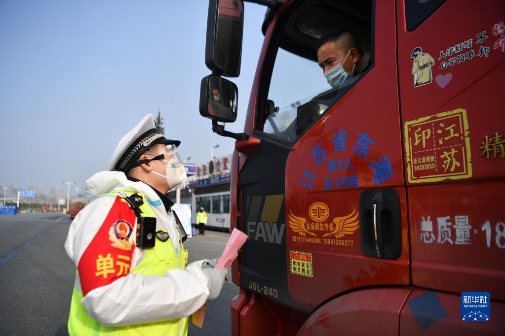 1月10日,西安市公安局浐灞生態(tài)區(qū)分局民警在西安市繞城高速新筑收費站查驗駕駛員健康碼。新華社記者 張博文 攝