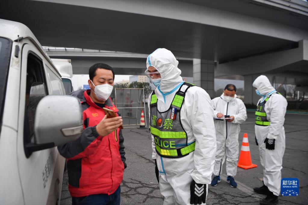 1月10日,西安市公安局浐灞生態(tài)區(qū)分局民警在西安市繞城高速新筑收費站查驗車輛通行證件。新華社記者 張博文 攝