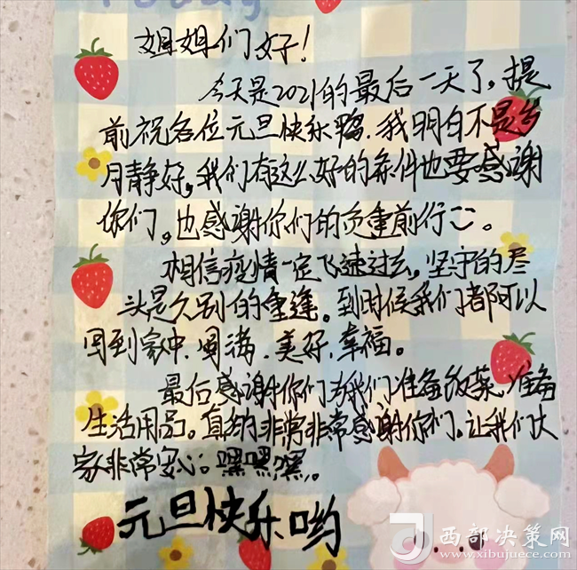 12月31日晚,即將迎來我國傳統(tǒng)佳節(jié)元旦。隔離學生怡忻悅通過手機向田甜發(fā)來了一張留言卡片,“姐姐好!今天是2021年的最后一天了,提前祝大家元旦快樂。我明白不是歲月靜好,我們有這么好的條件要感謝你們,感謝你們的負重前行。相信疫情一定飛速過去,堅守的盡頭是久別的重逢,到時候我們都可以回到家中,圓滿、美好、幸福。最后感謝你們?yōu)槲覀儨蕚滹埐?,準備生活用品,讓我們大家非常安心?rdquo;學生們一句句發(fā)自肺腑、情真意切的心里話在這數(shù)九寒天里溫暖和鼓舞著每一名后勤保障人員,讓大家的疲憊一掃而空,渾身充滿了干勁和戰(zhàn)勝疫情的巨大信心。