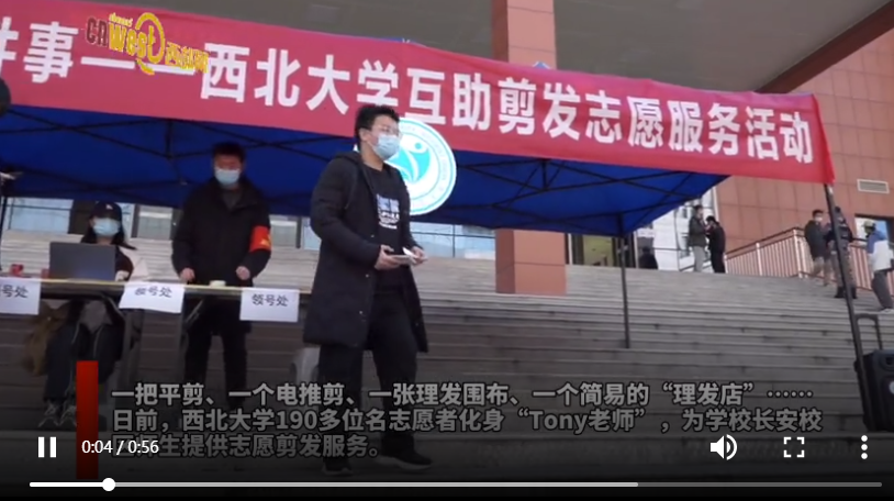 一把平剪、一個(gè)電推剪、一張理發(fā)圍布、一個(gè)簡(jiǎn)易的“理發(fā)店”……日前,西北大學(xué)190多位名志愿者化身“Tony老師”,為學(xué)校長(zhǎng)安校區(qū)師生提供志愿剪發(fā)服務(wù)。