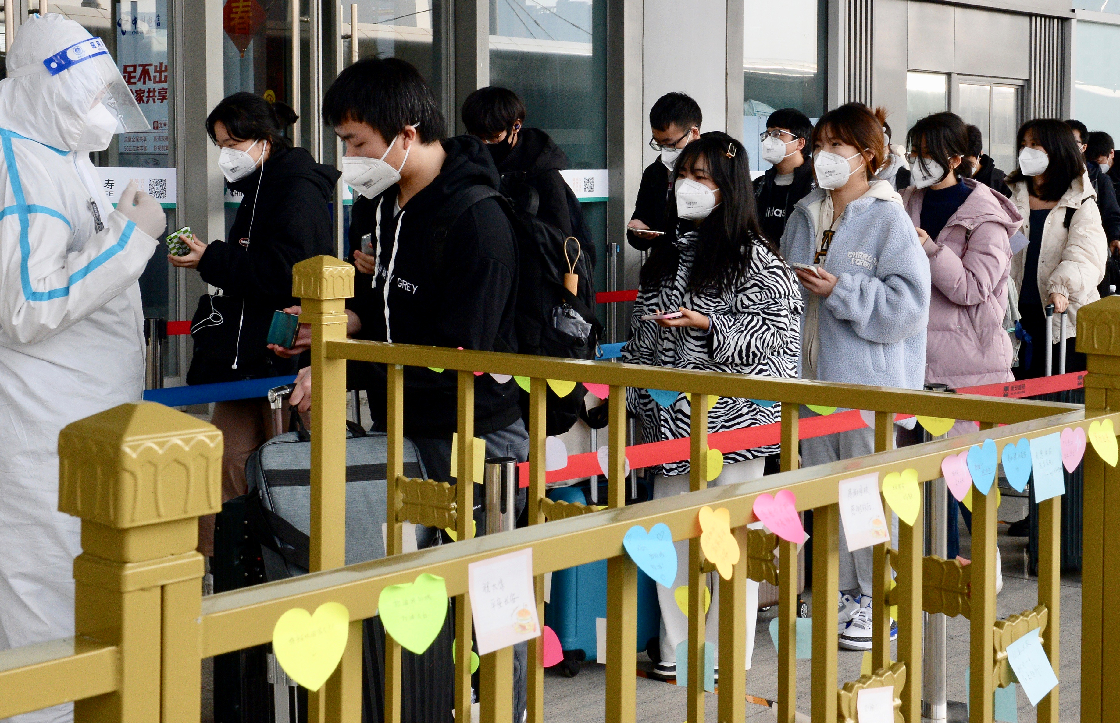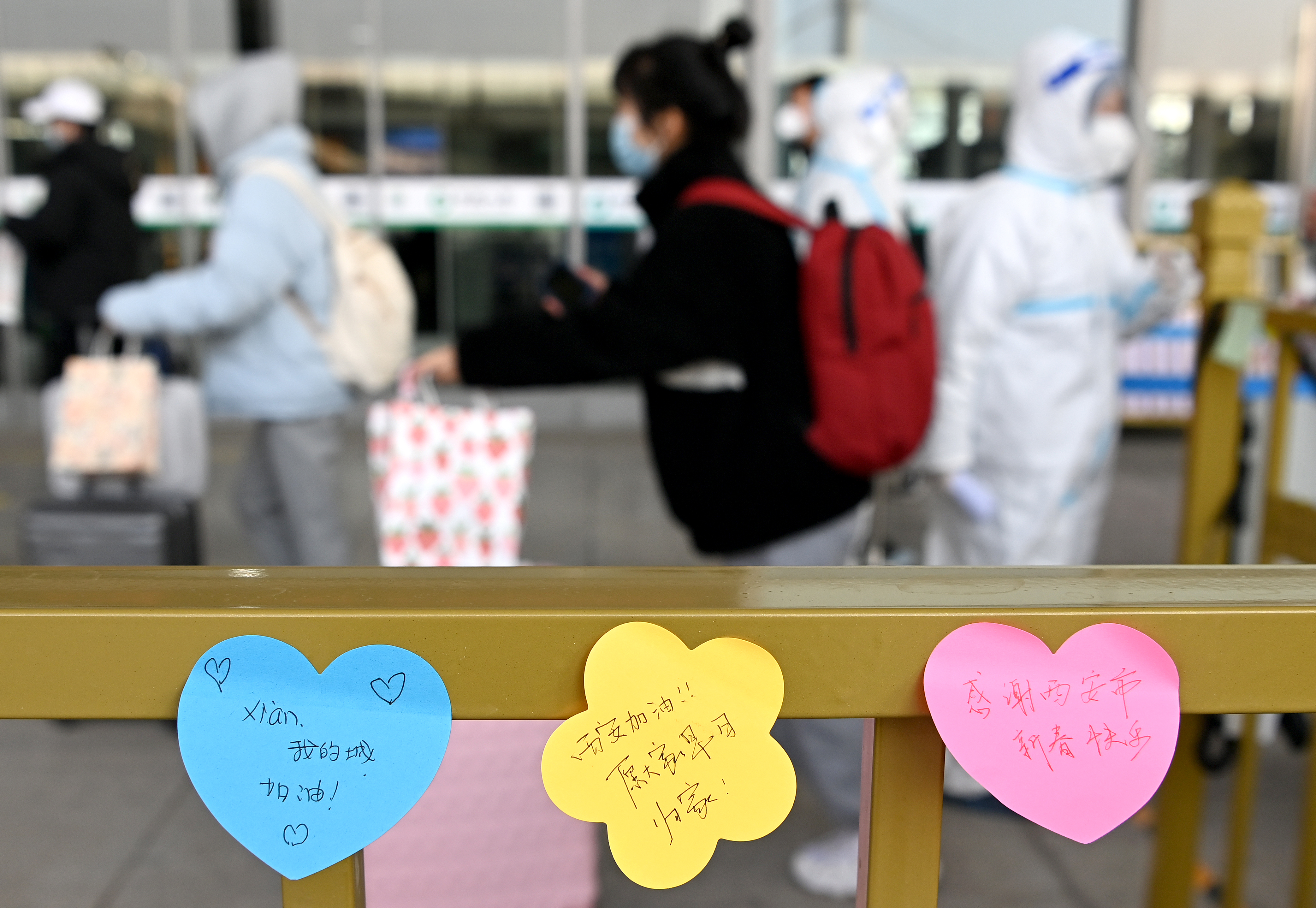 1月16日,西安北客站,進(jìn)站口的欄桿上留下了離校返鄉(xiāng)西安高校學(xué)生的暖心留言。 新華社記者 劉瀟 攝