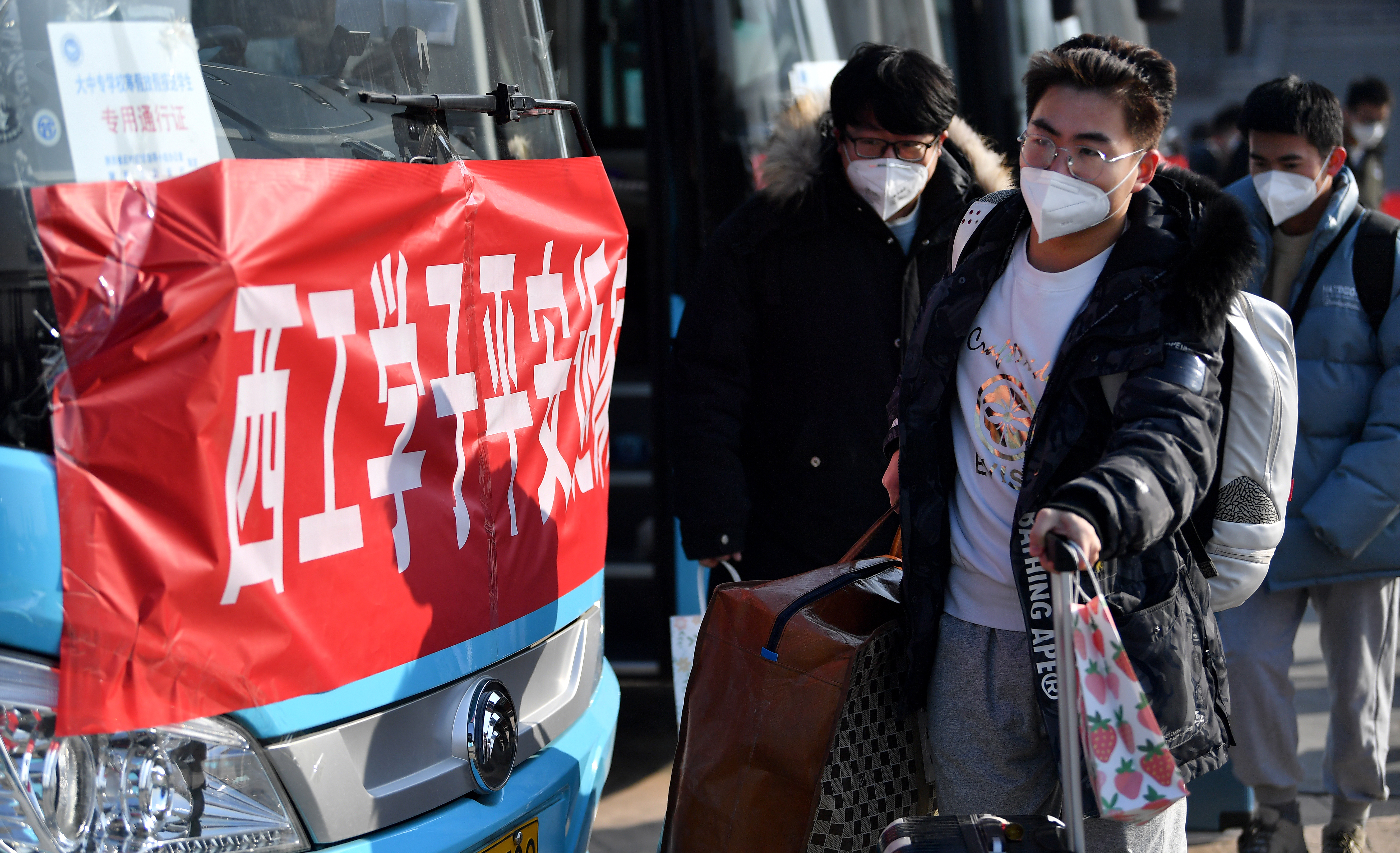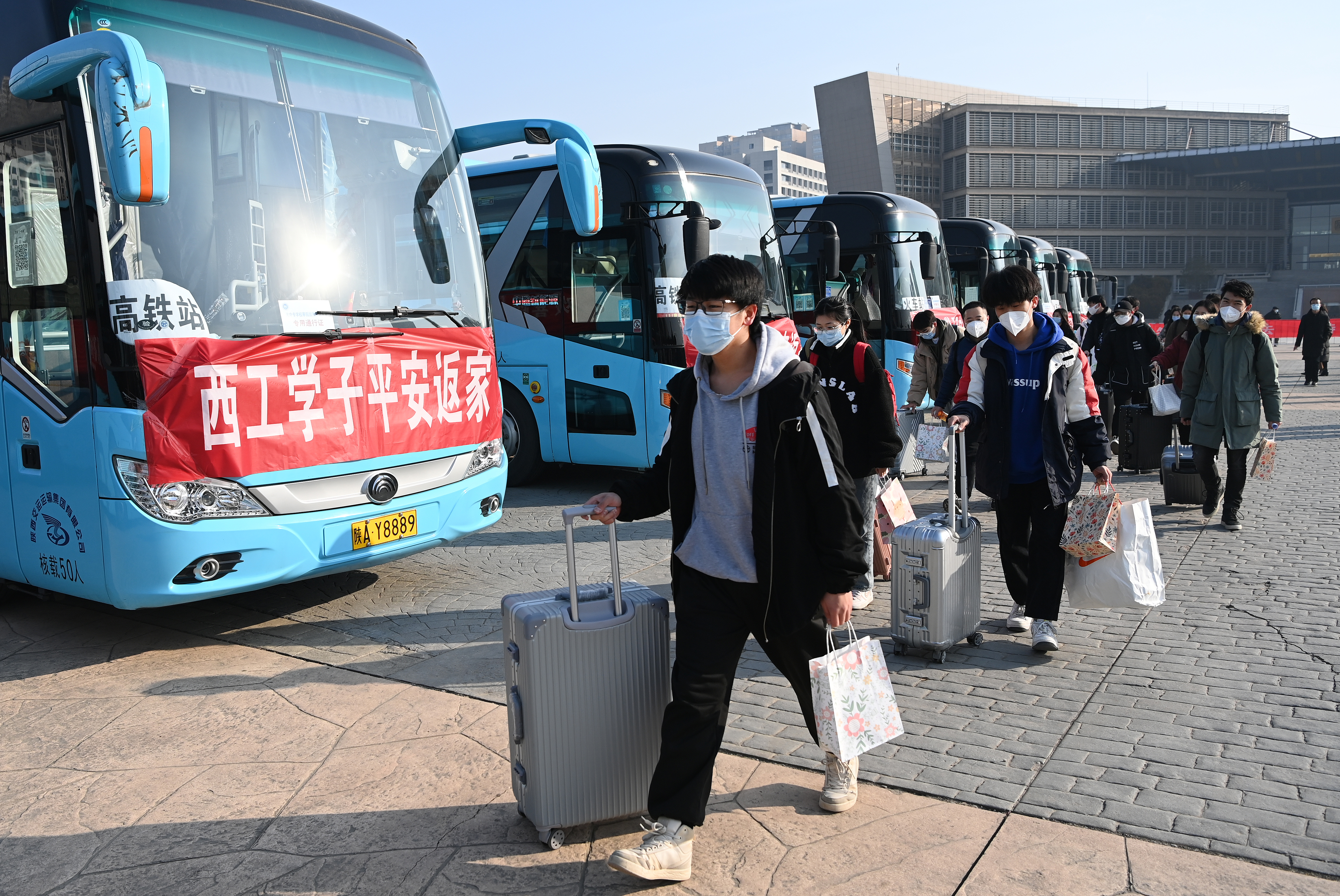 1月16日,西安工業(yè)大學(xué)未央校區(qū)的學(xué)生準(zhǔn)備乘坐統(tǒng)一安排的大巴前往車站。