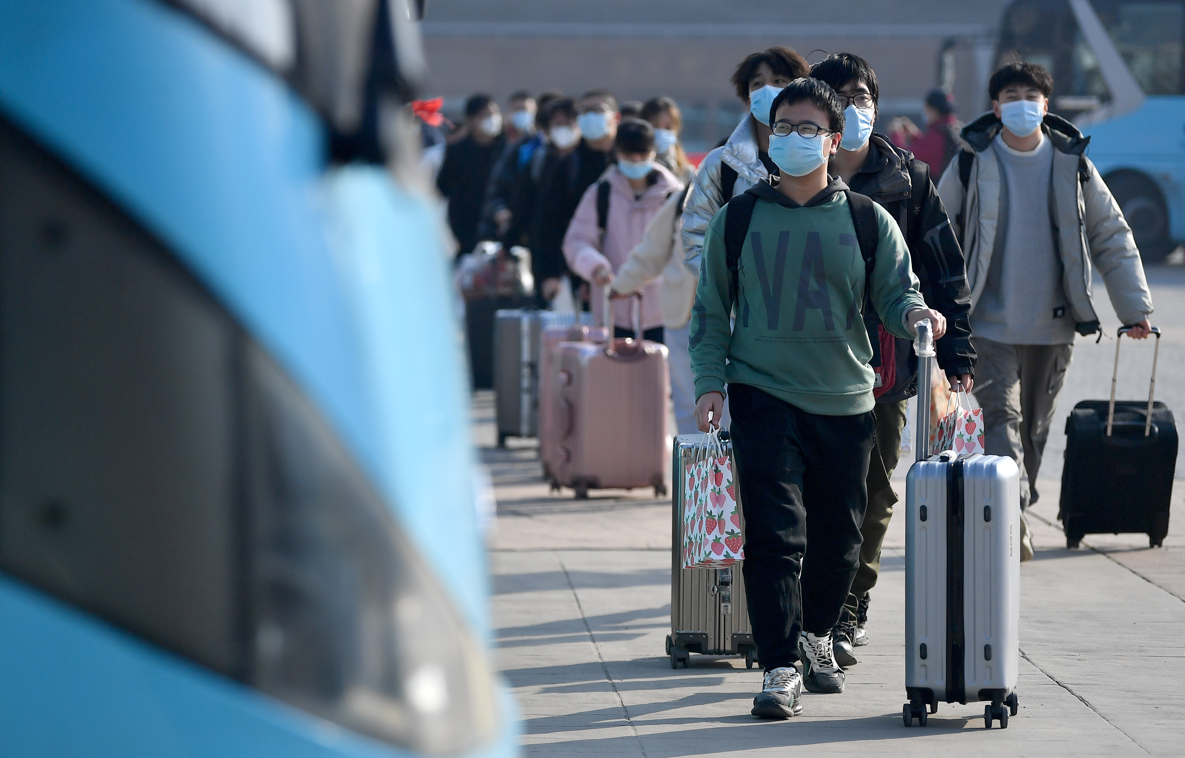 1月16日,西安工業(yè)大學(xué)未央校區(qū)的學(xué)生準(zhǔn)備乘坐統(tǒng)一安排的大巴前往車站。新華社記者 劉瀟 攝