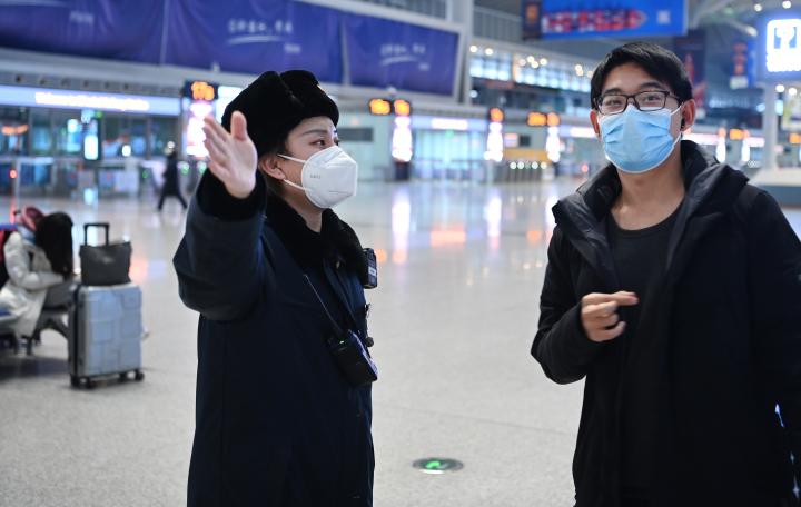 1月16日,西安北站客運員(左)在候車大廳引導旅客乘車。新華社記者 陶明 攝