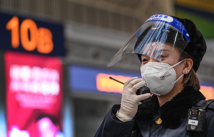 1月16日,西安北站檢票客運員向站臺聯控檢票車次信息。新華社記者 陶明 攝