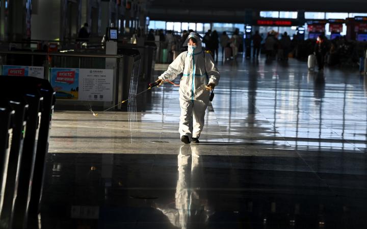 1月16日,工作人員在對西安北站候車大廳進行環(huán)境消毒。新華社記者 陶明 攝