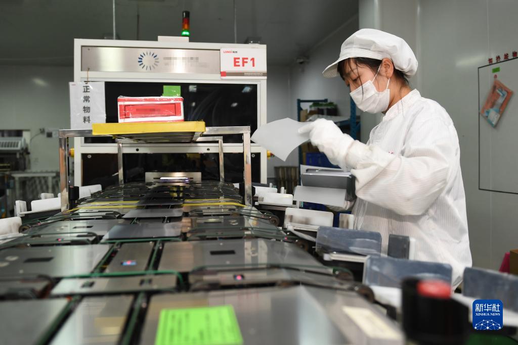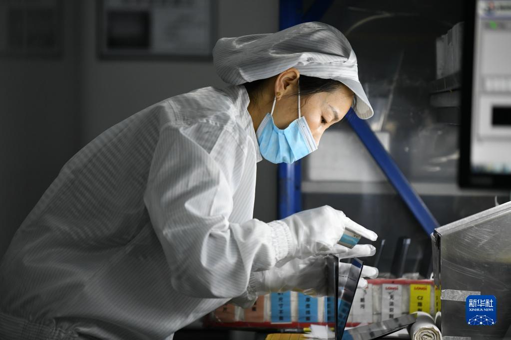 1月18日,在隆基綠能科技股份有限公司西安切片工廠,工人在進(jìn)行檢測包裝作業(yè)。新華社記者 李一博 攝