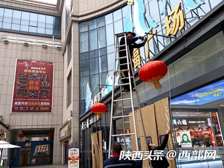 在鄠邑區(qū)海福廣場(chǎng),工作人員掛起大燈籠