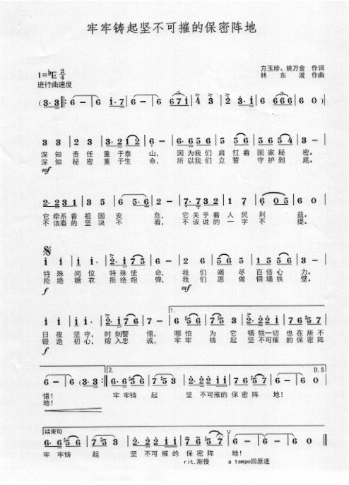 慶祝建黨百年獲獎(jiǎng)歌曲作品選集——《牢牢鑄起堅(jiān)不可摧的保密陣地》詞曲。