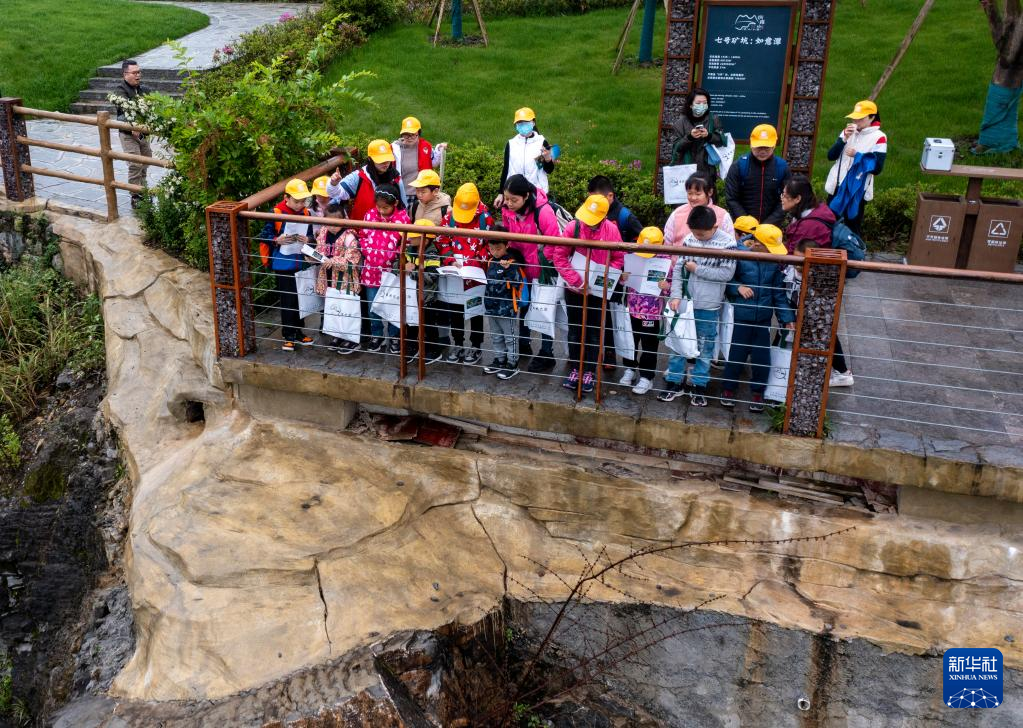 4月17日,參加活動的中小學生在地質(zhì)專業(yè)工作人員的帶領(lǐng)下,對銅鑼山礦山公園的地質(zhì)遺跡和生態(tài)修復進行科學考察(無人機照片)。