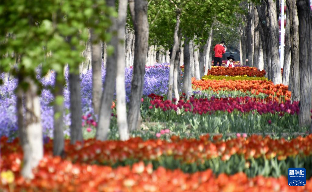 4月19日,游人在北臧村鎮(zhèn)永定河畔的綠色港灣內(nèi)拍攝盛開(kāi)的郁金香。
