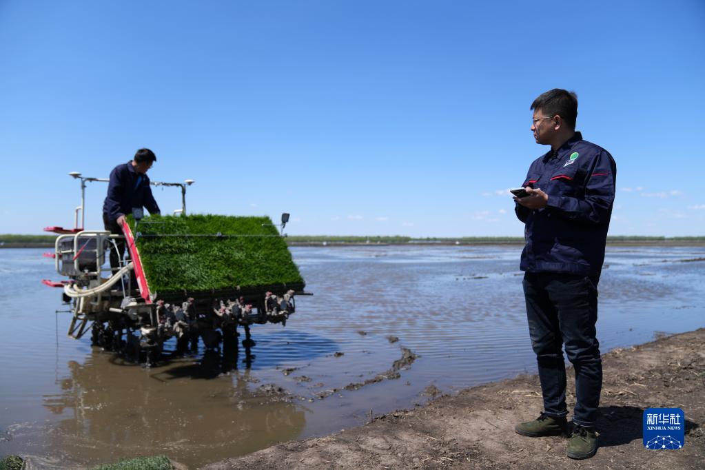 在北大荒集團(tuán)建三江分公司七星農(nóng)場(chǎng)有限公司萬畝稻田邊,農(nóng)機(jī)手陸向?qū)нB續(xù)輕觸兩下手機(jī),一臺(tái)帶有北斗導(dǎo)航系統(tǒng)的無人駕駛插秧機(jī)開始作業(yè)。