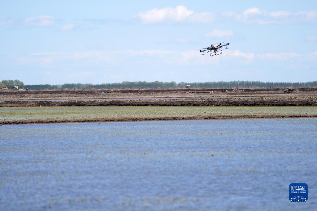 無人機(jī)在北大荒集團(tuán)七星農(nóng)場(chǎng)有限公司一塊稻田中作業(yè)(5月18日攝)。新華社記者 王建威 攝
