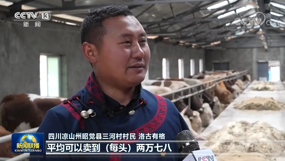 四川涼山州昭覺縣三河村村民 洛古有格:當(dāng)時總書記來的時候,我們這個養(yǎng)牛只有十幾頭。通過發(fā)展,我們?nèi)哟逵辛?000多頭這個西門塔爾?!,F(xiàn)在我們這個牛,平均可以賣到(每頭)兩萬七八,大的可以賣到三萬多元,效益特別好。
